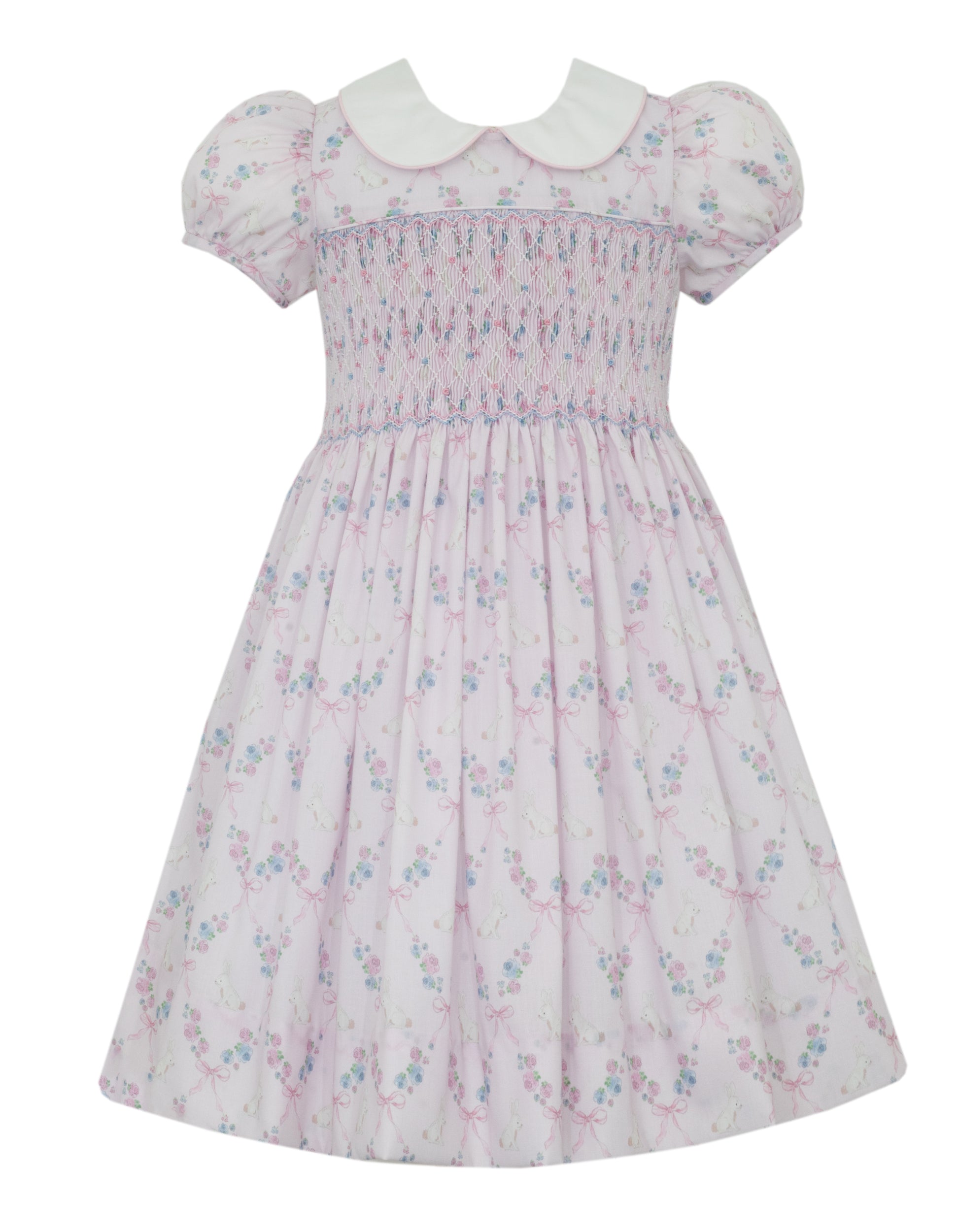 Pale pink bunny print smocked dress with collar- Easter egg hunt ready!