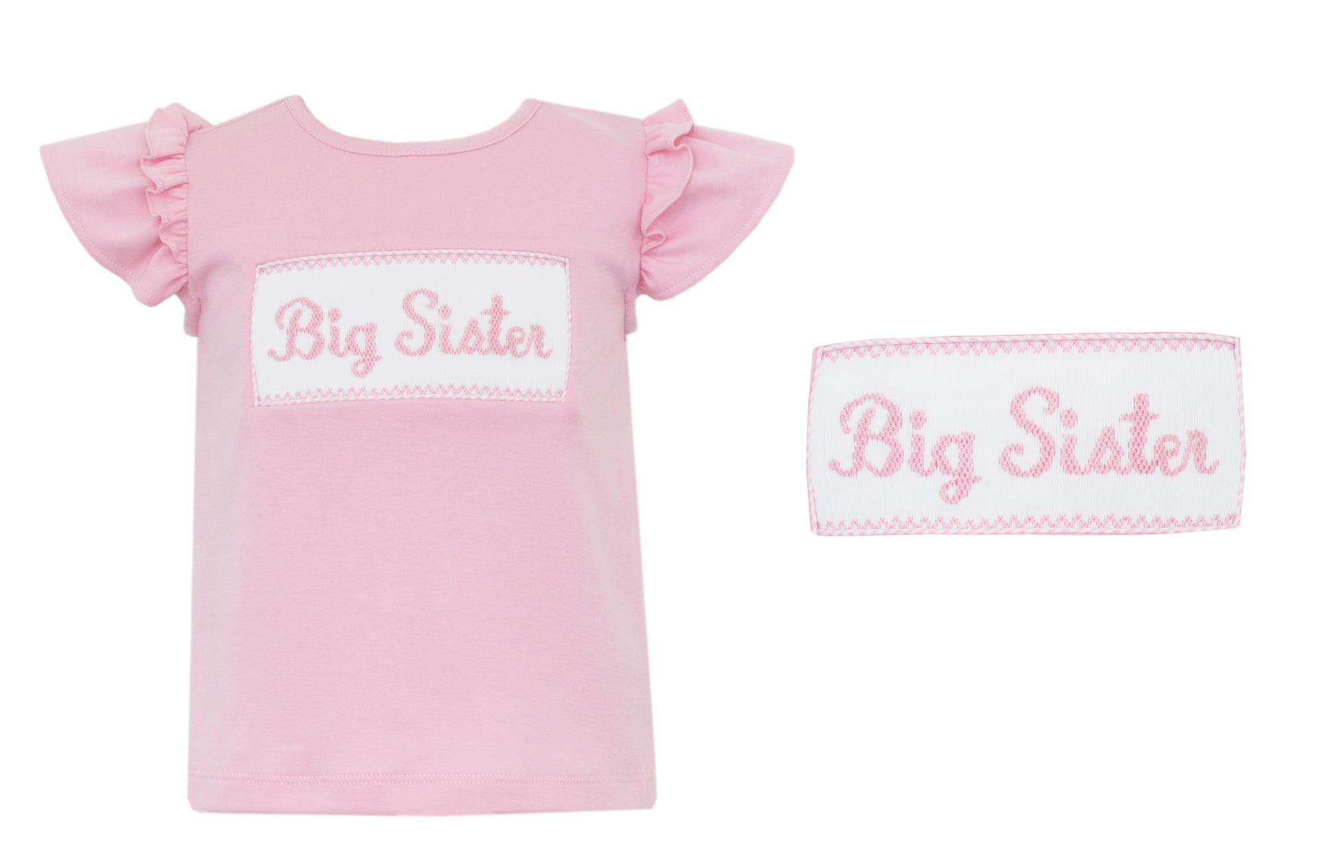 Bright pink flutter sleeve tee with smocked Big Sister design