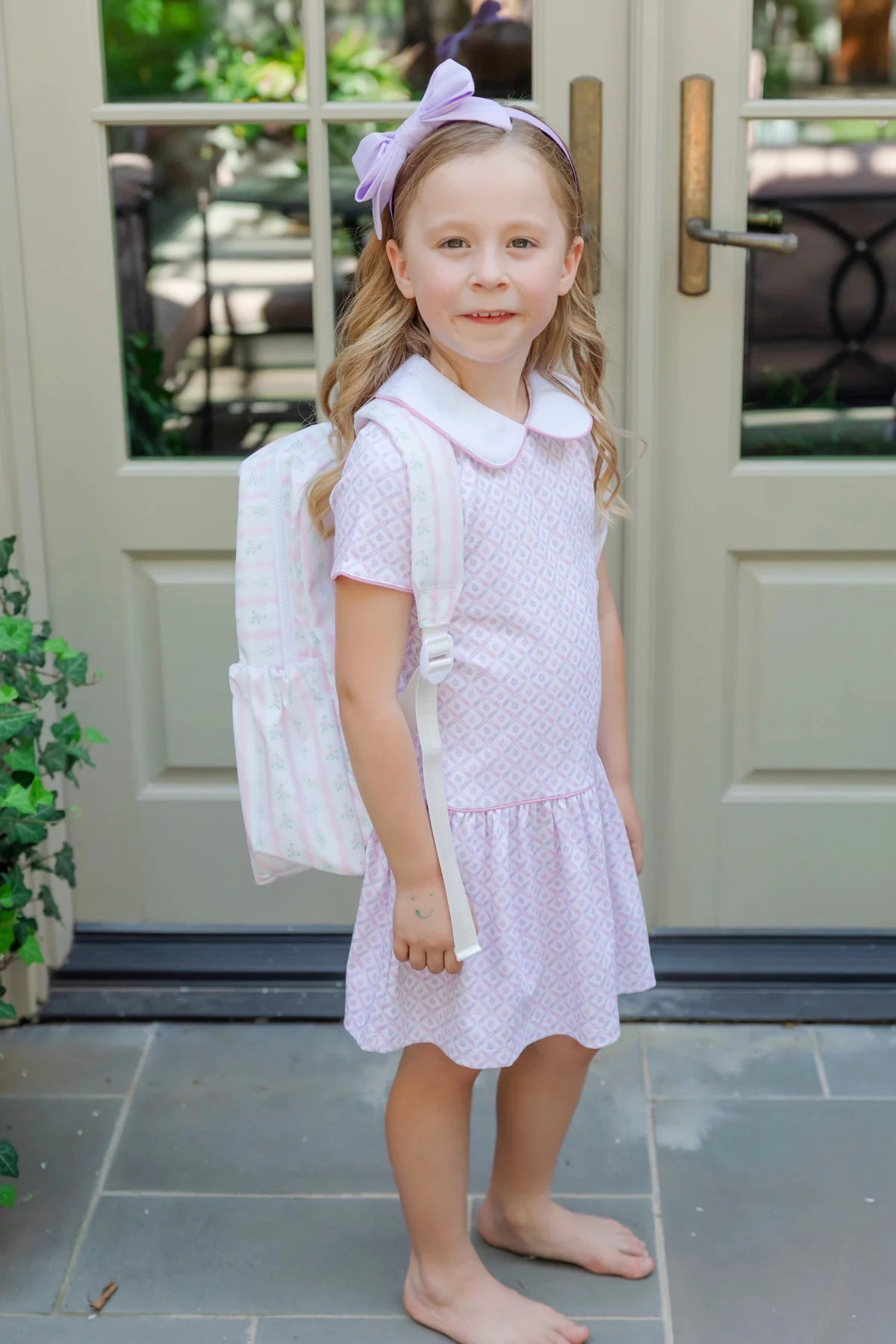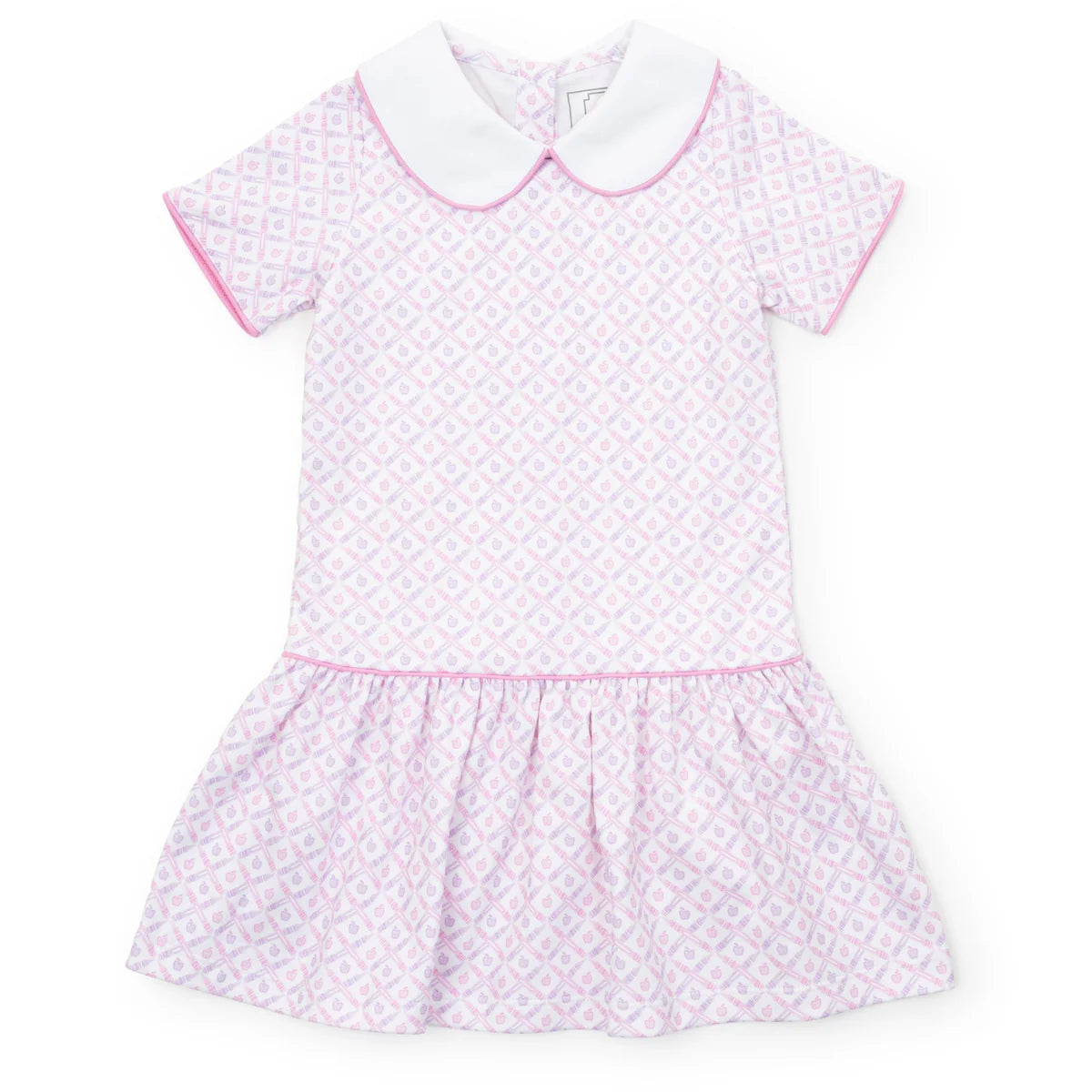 Short sleeve pima cotton dress with peter pan collar and contrast piping. Button closure up the back. Drop waist ruffled skirt.