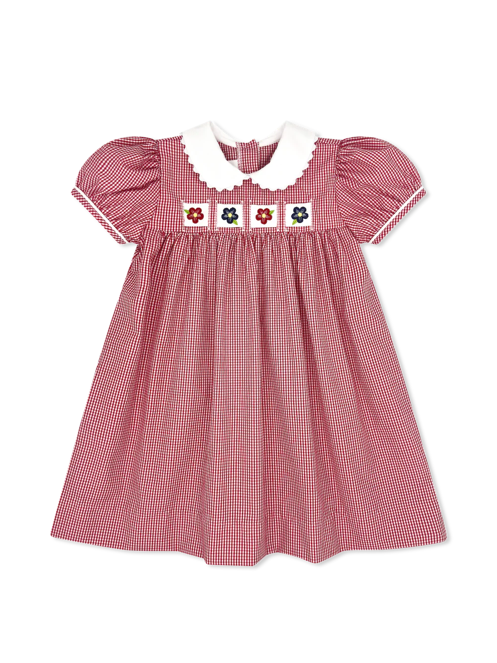 Our Ruth Ribbon Dress is a Lullaby Set classic. This timeless dress is back this season Ridgeland Red Minigingham withwhite ric rac trim on the collar. The interchangeable ribbon detail that weaves across the front of the bodice makes this a versatile dress appropriate for school days, everyday, and Christmas.