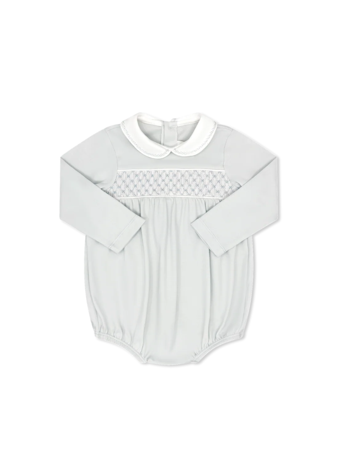 The Windsor Bubble in Park Blue knit fabric is accented with delicate blue and white smocking with featherstitching along the white collar. This is a precious piece for a sunny day out and about.