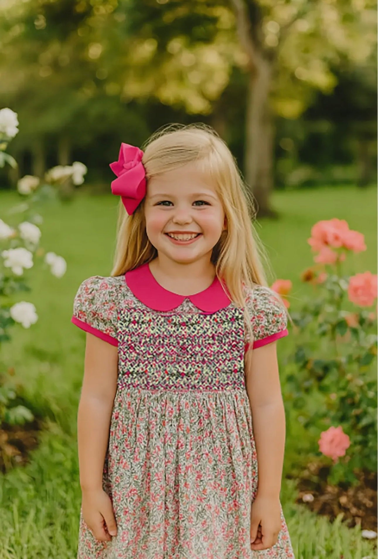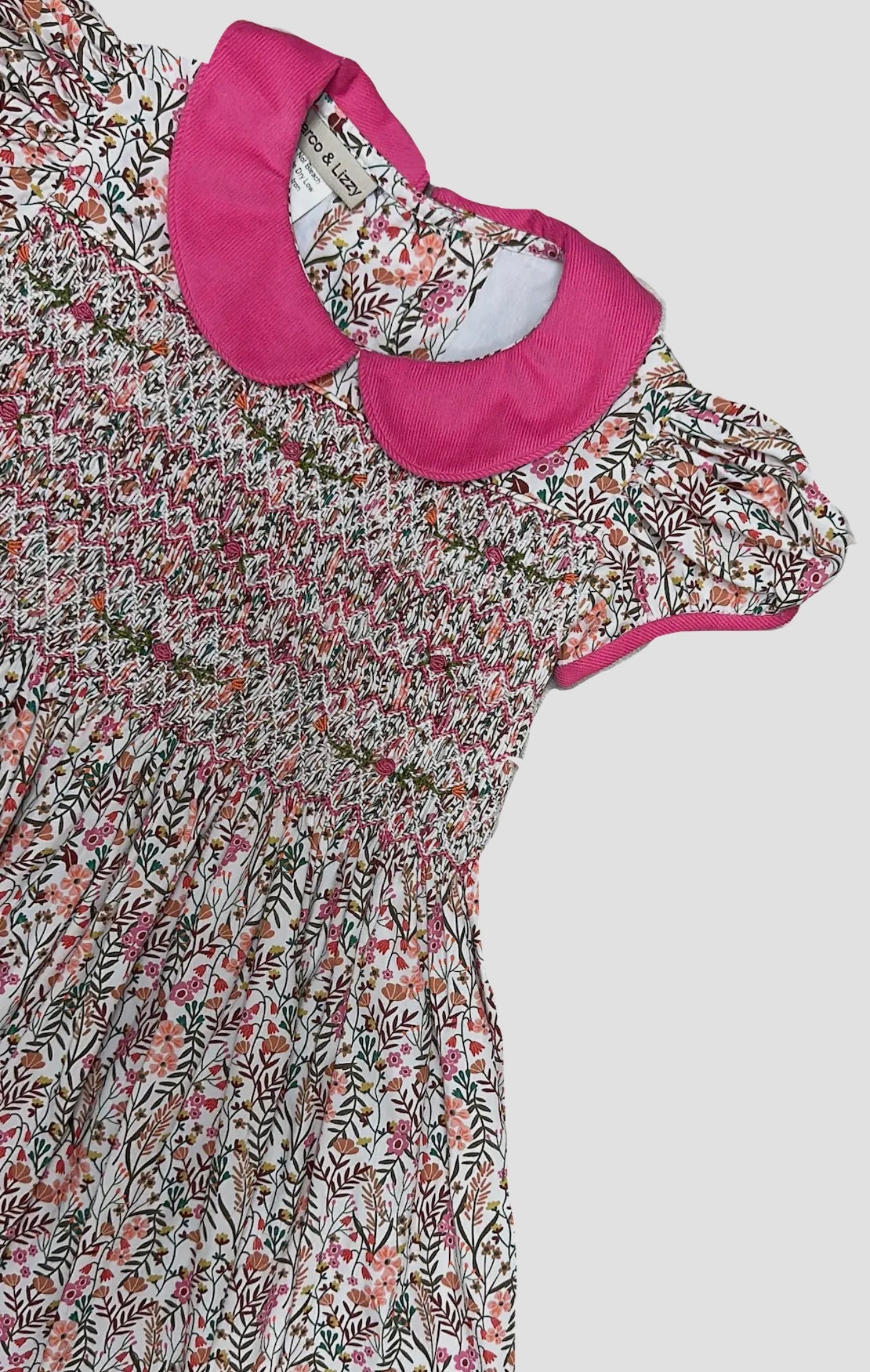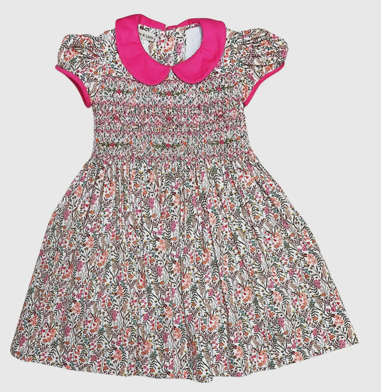 This charming Fall girl's 100% cotton dress features a vibrant floral print in soft pinks, reds, and greens, creating a playful and fresh look. The dress is smocked at the bodice for a comfortable and flattering fit, and it is accented with a bright pink Peter Pan collar for a pop of color. The puffed short sleeves add a delicate touch, making this dress perfect for both casual outings and special occasions. A lovely choice for your little one’s fall wardrobe, offering both style and comfort.