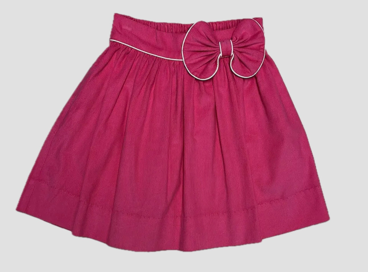 Add a pop of fun to her fall wardrobe with this vibrant hot pink skirt from our Amy and Lucas Collection. Made from soft corduroy, this sweet skirt features a beautifully gathered silhouette, trimmed with a crisp white piping at the waist and around the oversized bow for that extra touch of charm.