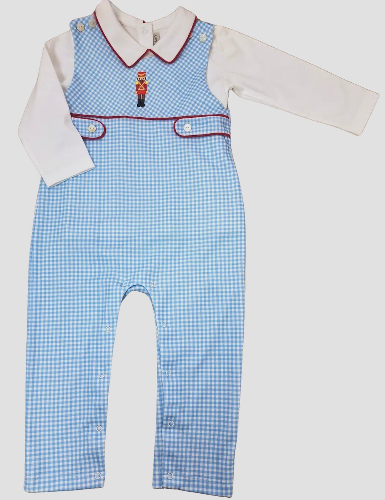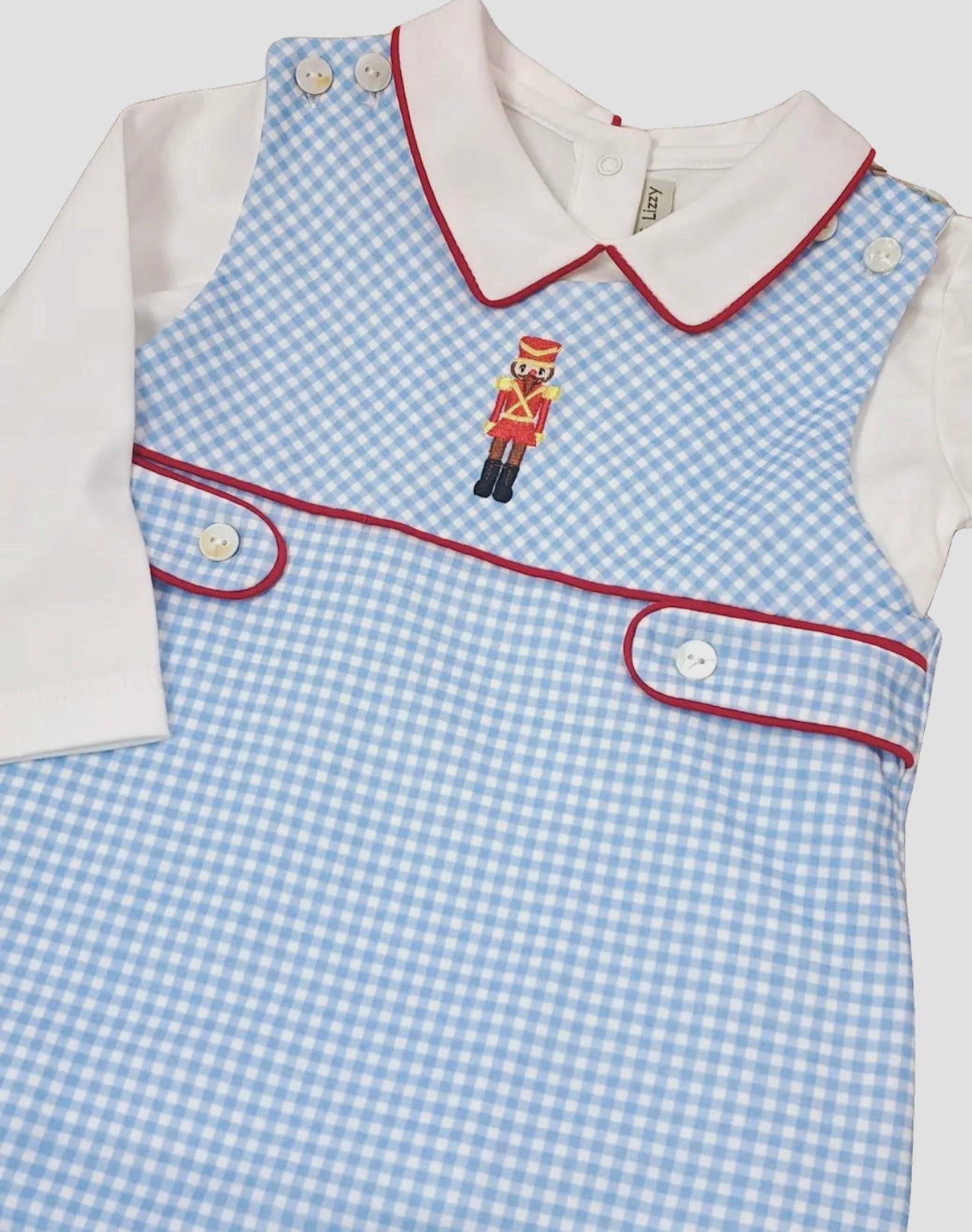 Celebrate the magic of the holidays with this charming blue gingham longall from Marco & Lizzy. Made from 100% soft cotton, it features a classic Peter Pan collar with red piping and an adorable, embroidered Nutcracker on the chest—perfect for your baby boy’s first Christmas photos. The gentle gathers ensure comfort and ease of movement, while the buttoned back and snap closures make dressing simple.