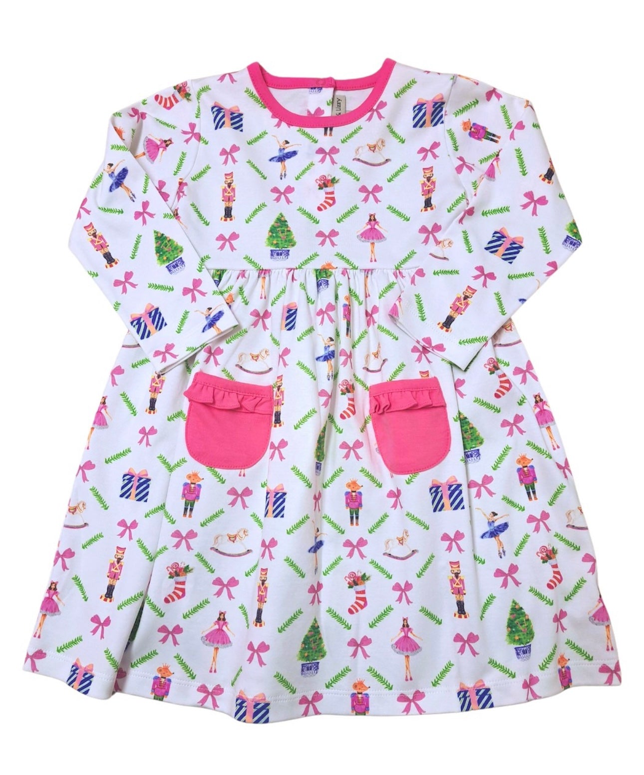 Step into the magic of the holidays with this charming Pastel Nutcracker Dress from Marco & Lizzy. Made from ultrasoft cotton knit, this sweet long-sleeve dress features a festive print filled with pastel nutcrackers, Christmas trees, gifts, and bows — perfect for celebrating the season in comfort and style. The playful design includes two bright pink ruffle pockets and matching pink trim around the neckline for a cheerful finishing touch.