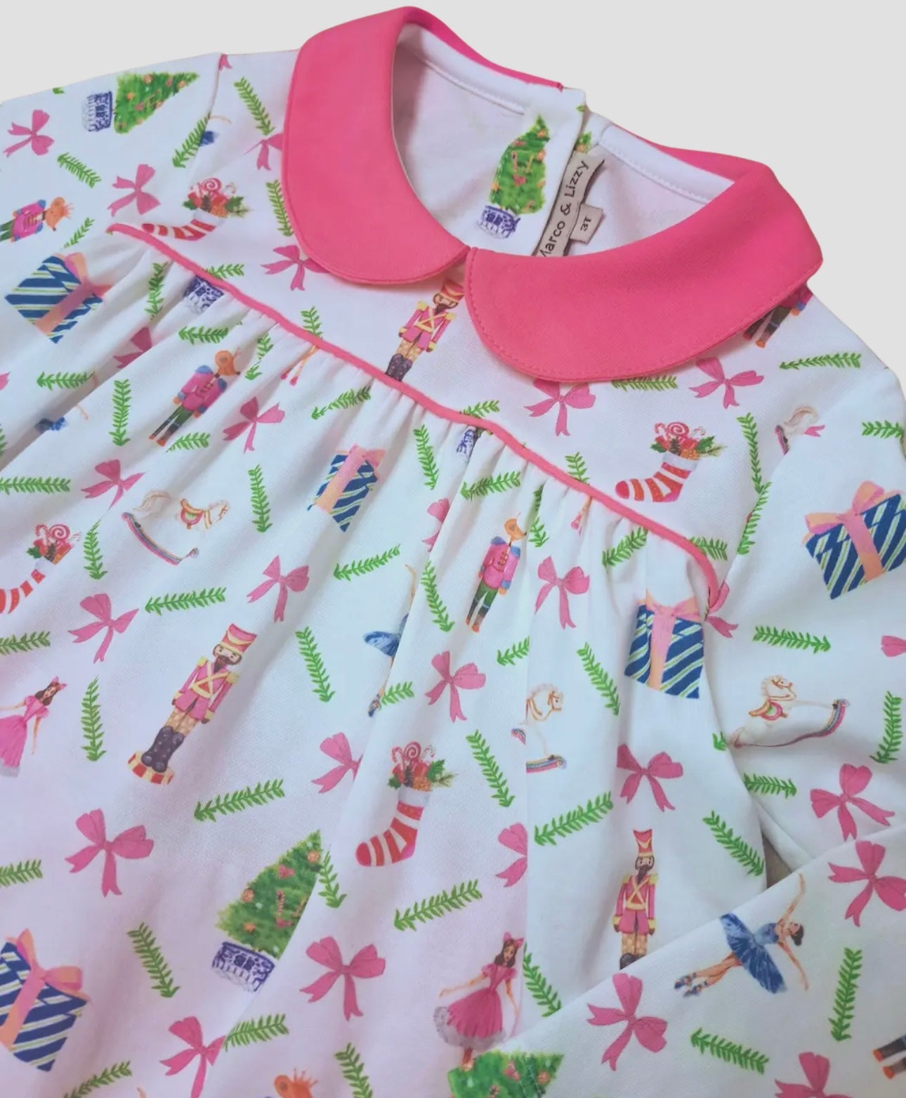 Step into the magic of the holidays with this darling Marco & Lizzy Nutcracker Christmas Tunic Set. Made from the softest knit, this festive outfit features a whimsical print of Christmas trees, nutcrackers, candy canes, and bows in cheerful, vibrant colors. The long-sleeve tunic is finished with a charming Peter Pan collar and pink piping detail, perfectly paired with cozy hot pink leggings for a playful yet polished holiday look.