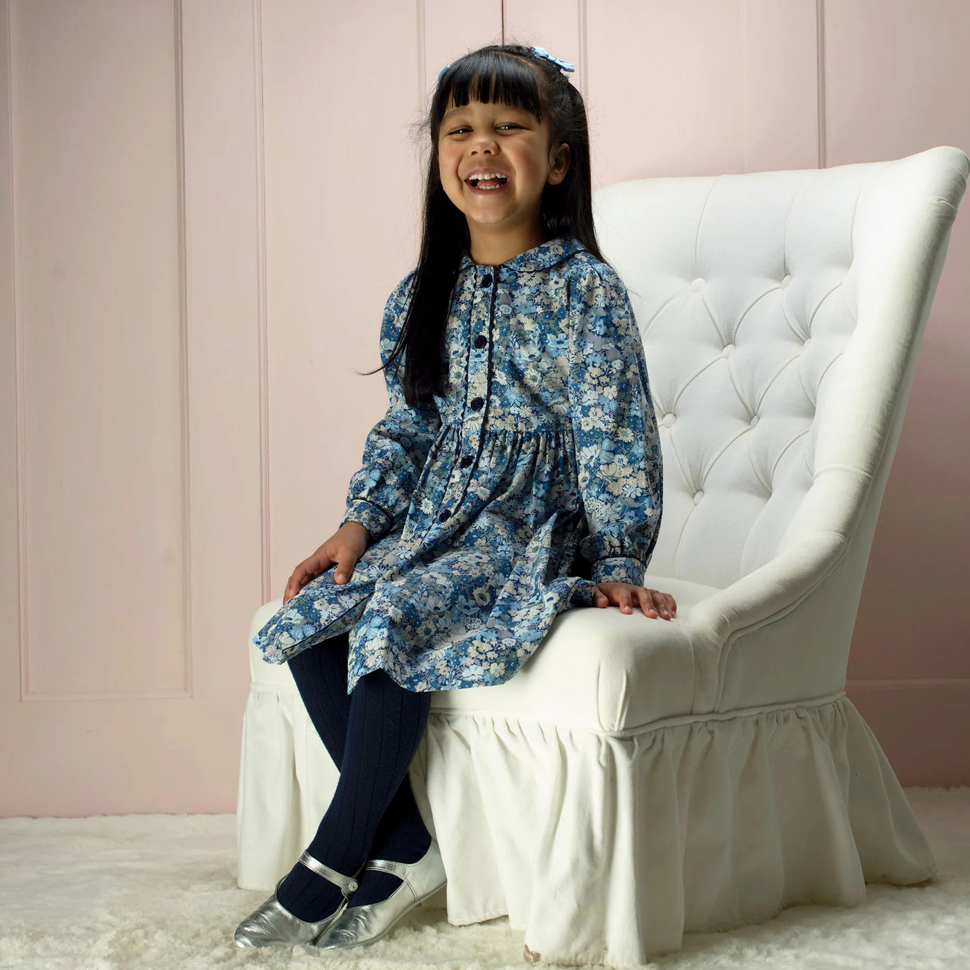 This beautiful button-front dress is perfect for your little one this season. Featuring an elegant floral print in blue shades on navy background and coordinating navy trims on collar, cuffs and button placket, the dress is stylishly soft and comfortable. Front button fastening make it easy to dress up or down. Kids will love the playful print!