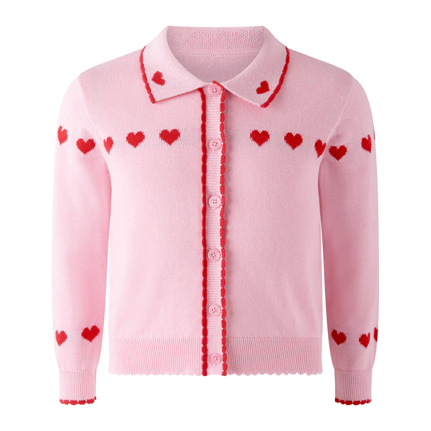 Rendered in a soft blush pink knit and adorned with rows of delicate red hearts, this classic button-front cardigan evokes nostalgia while offering modern comfort. Scalloped trims and a gently structured collar reflect meticulous attention to detail, making every wear feel truly special. Whether styled over a dress, paired with tailored trousers, or coordinated with matching sibling pieces, it becomes an instant heirloom—one to treasure and pass down.