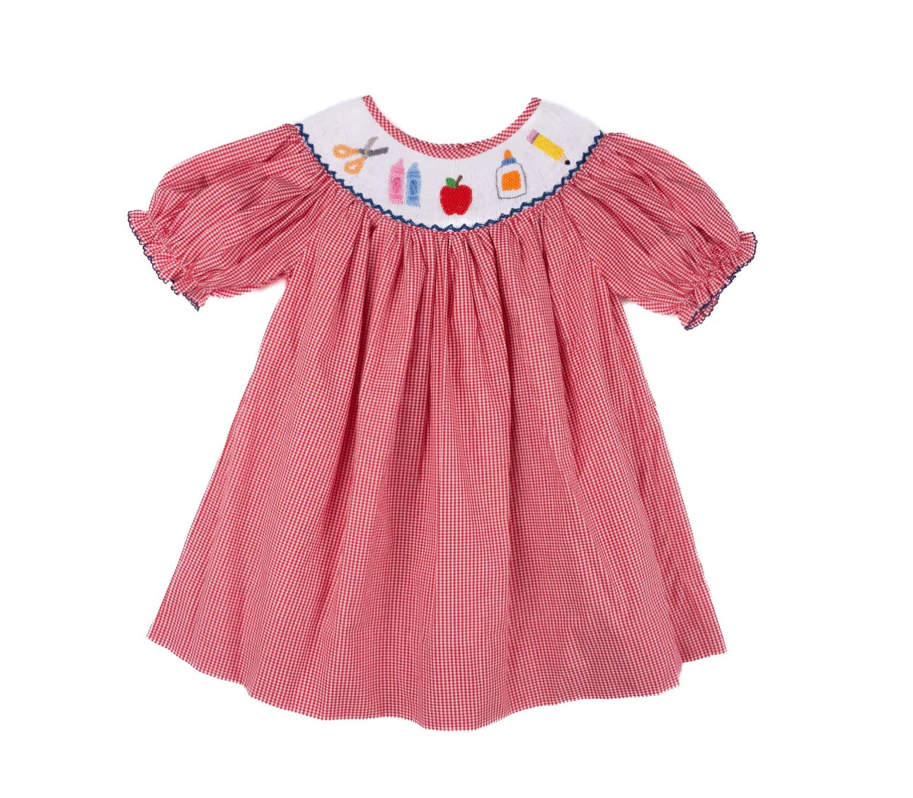 Sweet red mini check bishop style dress with smocked Back to School themes